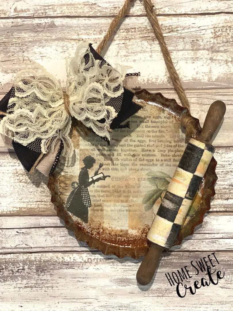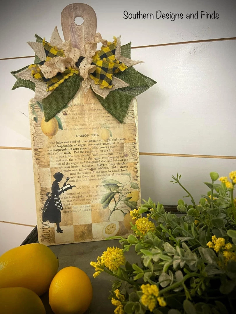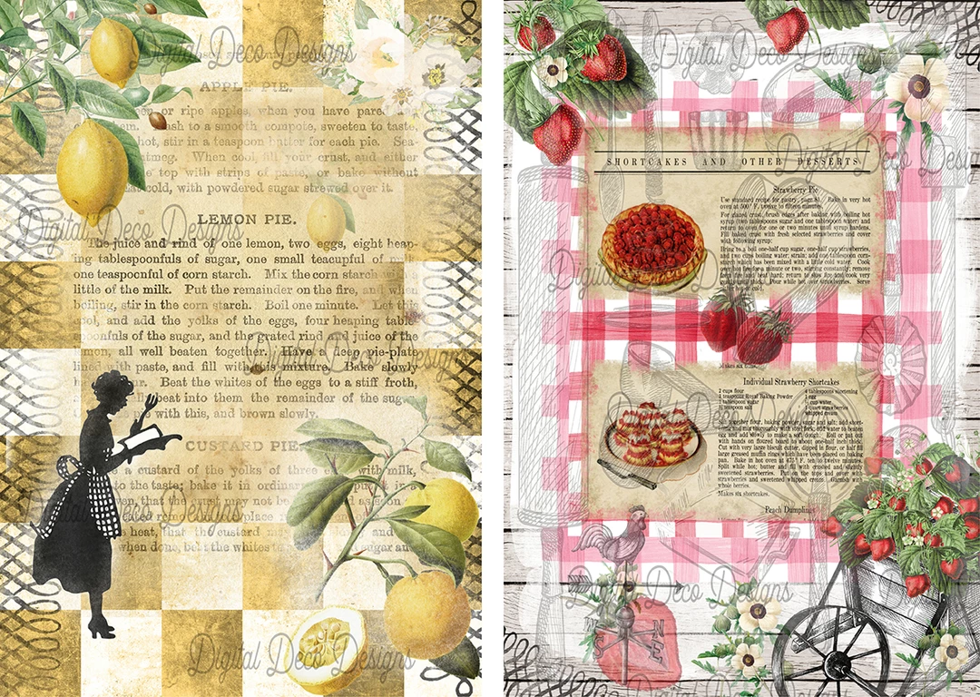 Yellow distressed checks, vintage lemons and white florals, with old pie recipes on old, grungy paper. A retro silhouette of a woman in an apron reading a cookbook make this design perfect for kitchen decoupage home decor such as cutting boards and rolling pins. Lemons are great for summer craft projects and wall decor.