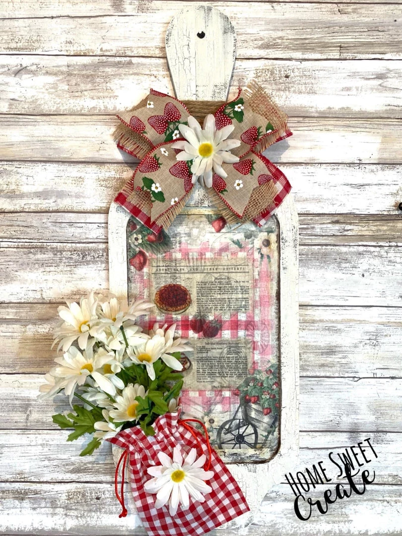Red and pink gingham pattern on a white washed wooden background, vintage strawberries with old pie recipes. A wheelbarrow, weathervane and kitchen cooking utensils make this design perfect for farmhouse kitchen decoupage home decor such as cutting boards and rolling pins. Strawberries are great for summer craft projects and wall decor.
