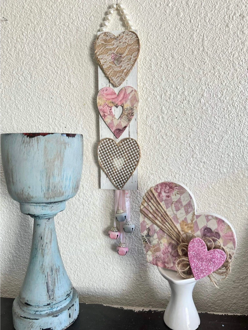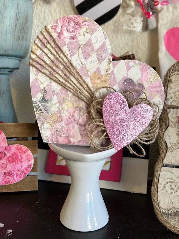 Vintage and Glam, shabby and chic! Crowns and harlequin print for European flair, pink roses, pink pearls and damask patterned hearts for vintage and gold and glitter for glam. This design is shabby chic and elegant. Perfect for Valentines Day Decor! What a beautiful gift you could make!Â