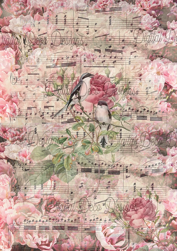 “Heart Song” is a beautiful shabby decoupage design with an old music sheet in the background. There are two versions of this piece. One with a hymnal “The Old Rugged Cross” and one without and with just music notes. Pink roses and florals cover the page with two vintage birds in the center on a tree branch. The music sheet gives the design an old, grungy feel while the soft shades of pink make it very feminine.Â