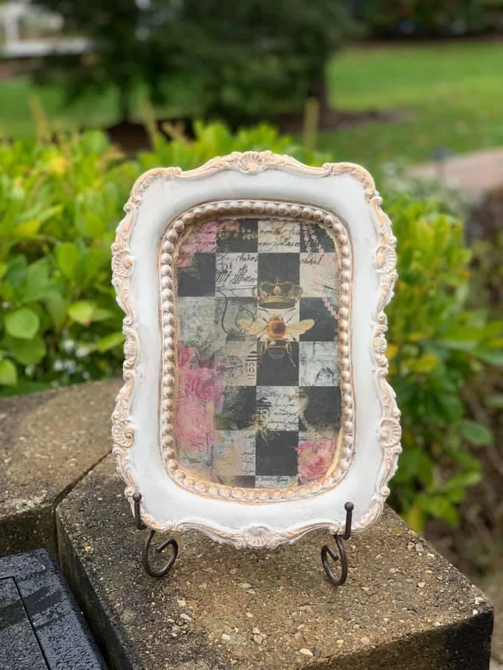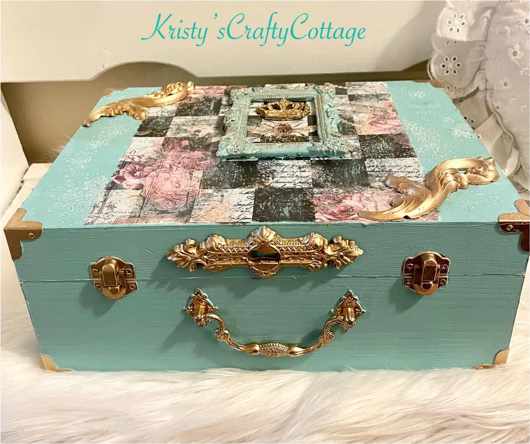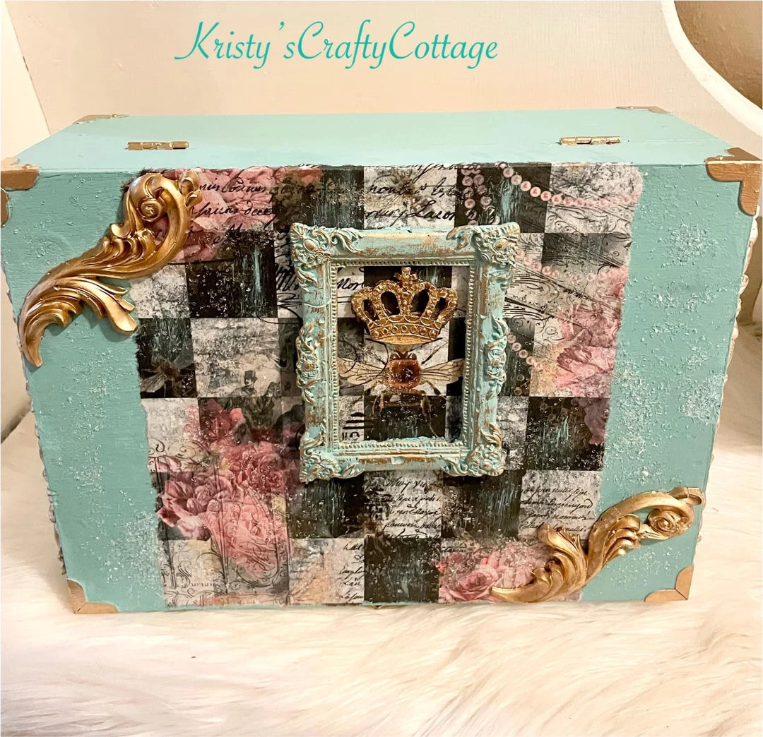 A real special design right here! This was a custom design inspired by one of my favorite crafters and creatives, the one and only Royal Funky Junque. She is an absolute QUEEN with a very specific crafting style and design. A collage of checks, and crowns, peonies and gold accents and a touch of vintage and old time vibes. This would be great for any decoupage project your heart inspires!