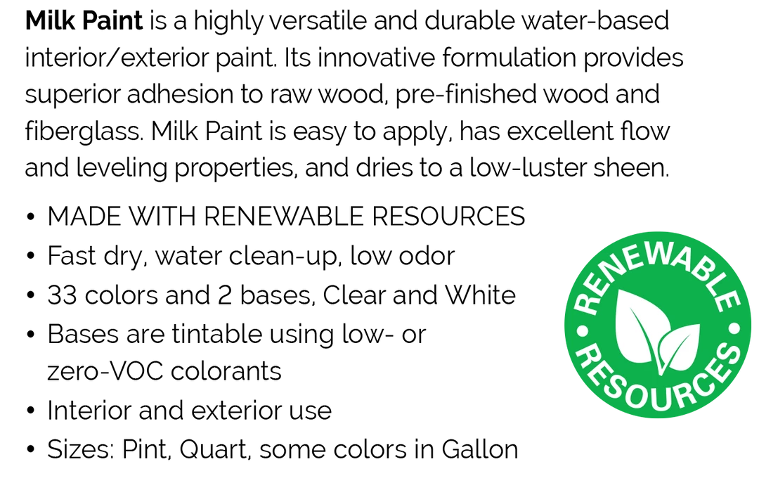 General Finishes Milk Paint is a premium low VOC, self-sealing interior/exterior mineral-based paint named for its low-luster sheen. So durable, it is a go-to finish for cabinets and furniture. It is now more environmentally friendly than ever, made with more than 50% RENEWABLE RESOURCES formulated from sustainable materials that decrease the carbon footprint. It can be brushed, rolled, or sprayed.