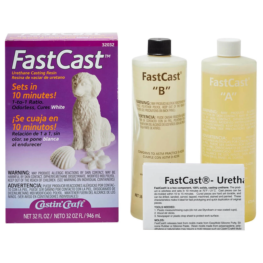 FastCast™ is a two-component clear urethane casting resin, which turns white once set. Easy to use, 1:1 ratio and is odorless. Ideal for casting, quick prototyping, miniatures, models, taxidermy and more. FastCast™ sets to a hard cast in approximately 10 minutes at 70°F. Once cured, FastCast can be drilled, sanded, shaped and painted.