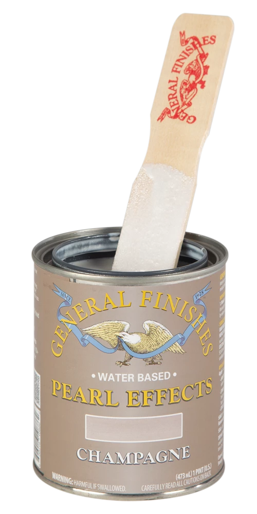 General Finishes Pearl Effects are water based decorative, acrylic pearlescent colors used to create specialty finish-es. They may be applied over General Finishes milk paint, water based topcoats and stains to create a metallic pearl effect. Pearl Effects will go on solid when sprayed or brushed but can be combined with topcoat for a translucent finish.