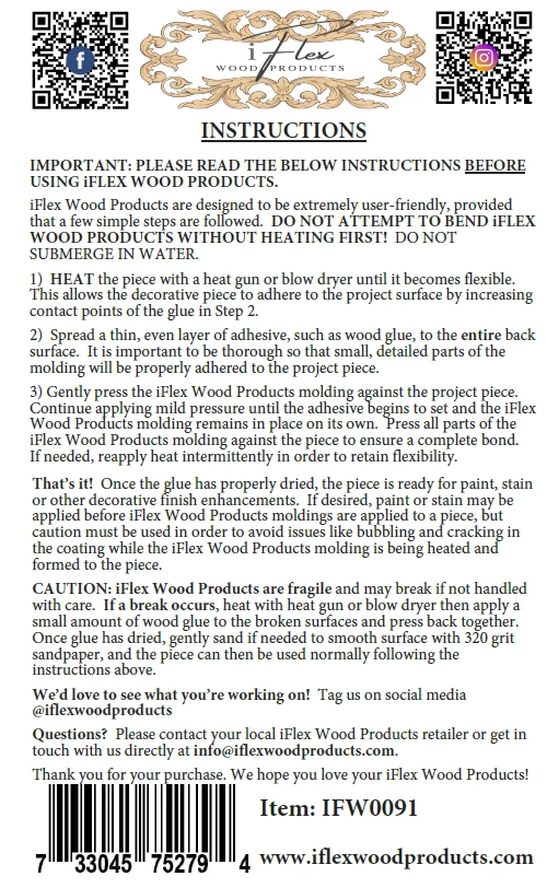 iFlex Wood Products are so easy to apply with a quality wood glue or adhesive. They bend with the aide of heat from a hair dryer or heat gun. These amazing embellishments will give an added flair to your craft and furniture projects and so much more! Â